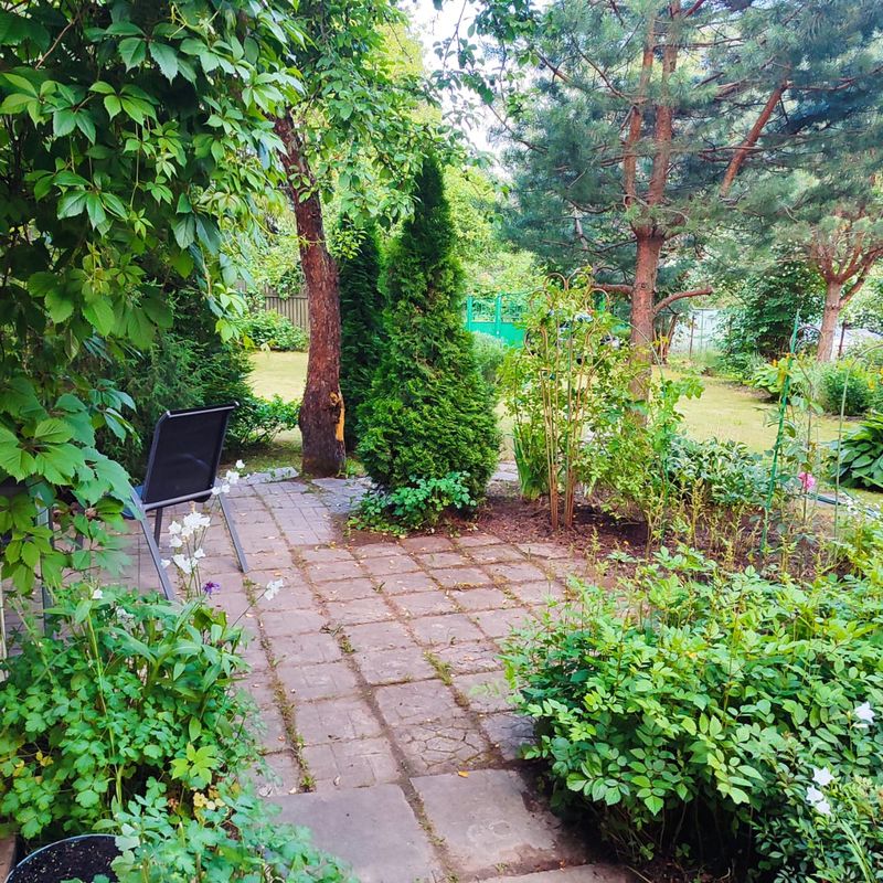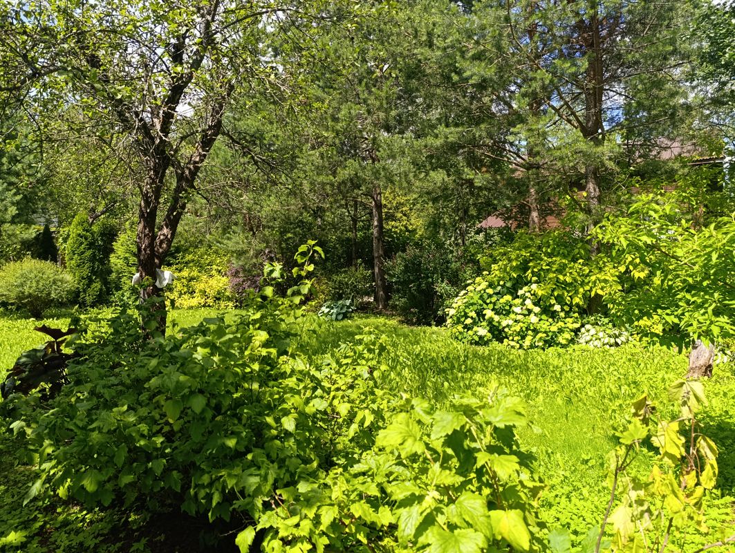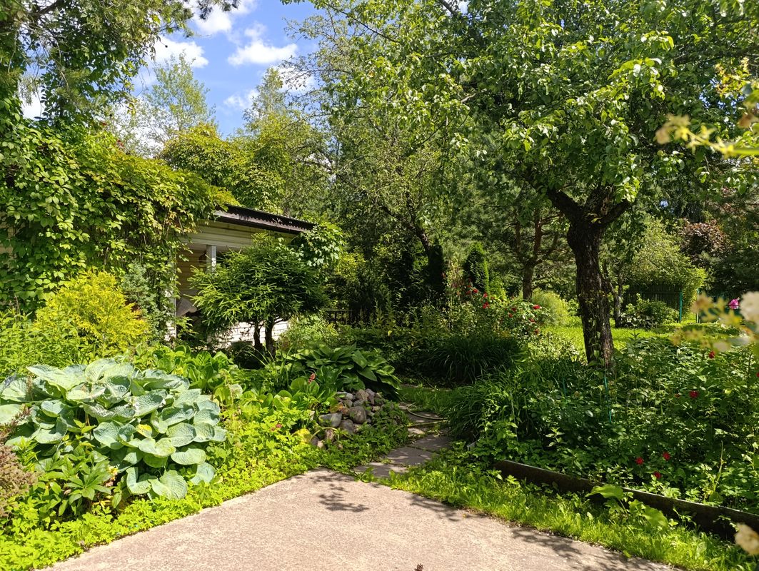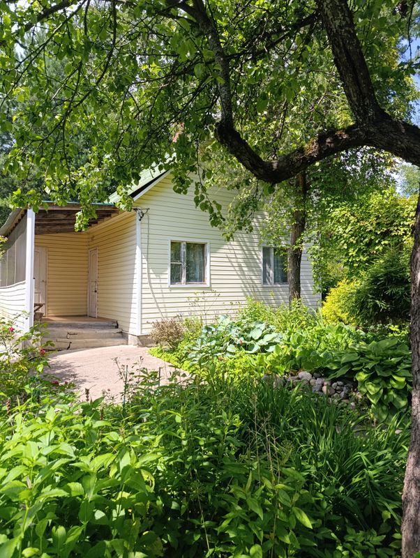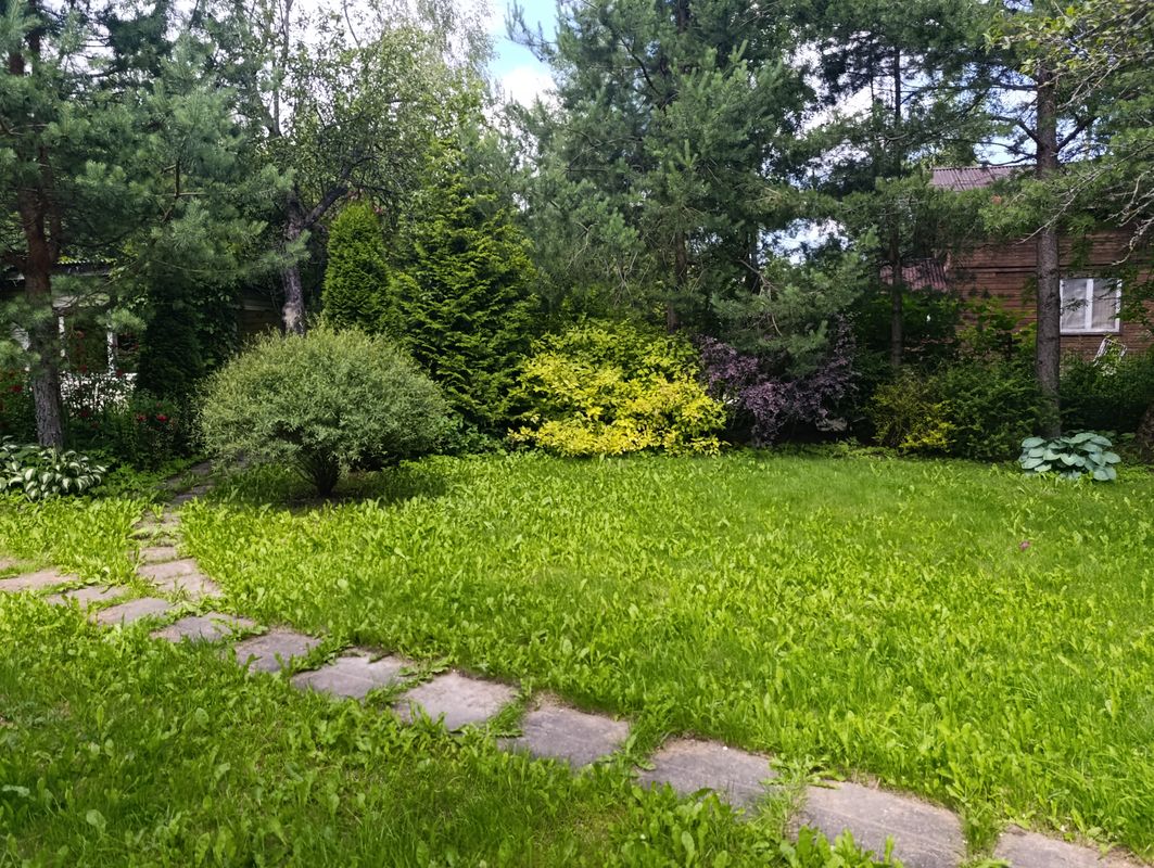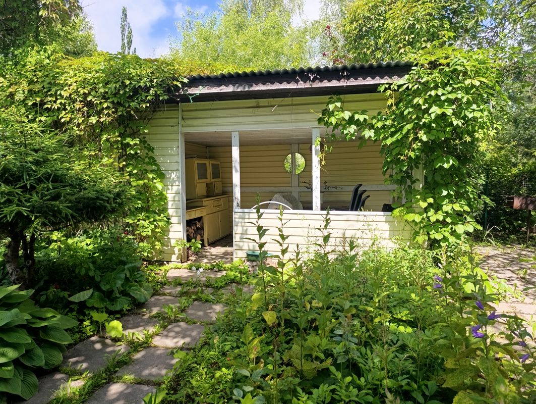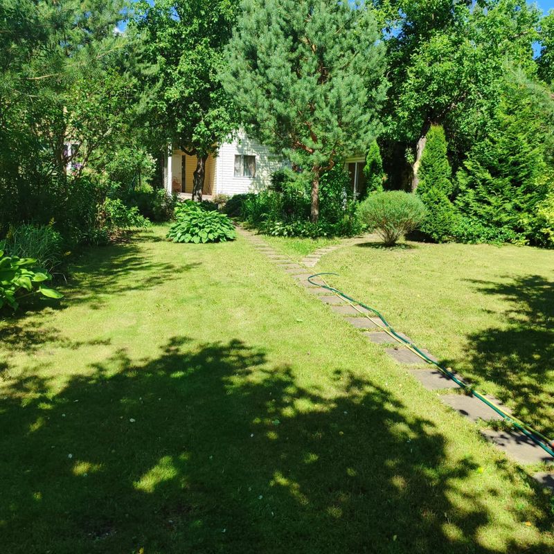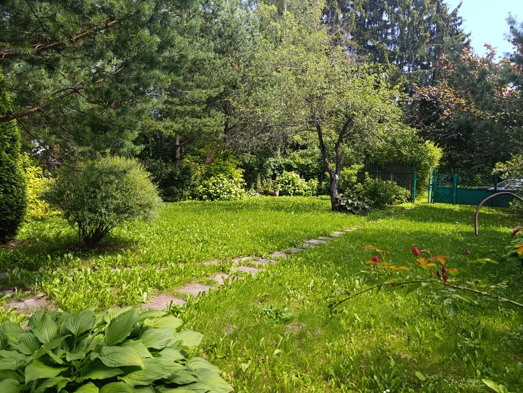 Участок 7 соток, ухоженный, ровный, сухой. На участке посажены декоративные кустарники, газон, цветы, туи, сосны, яблони, смородина. Есть беседка и уличный туалет.